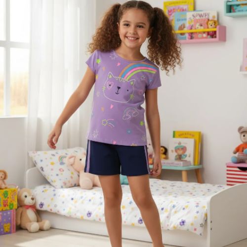O conjunto infantil arco íris para menina, disponível nos tamanhos de 10 a 14 anos com estampa, é uma escolha divertida e confortável para as meninas. Composto por uma blusa leve e macia. O short em algodão contém cós com elástico que garante conforto e liberdade de movimento. Este conjunto é ideal para os dias quentes, proporcionando frescor e estilo, seja para brincar, passear ou momentos casuais em família.