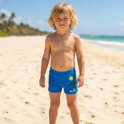 Sunga infantil boxer. Confeccionada em poliéster com elastano e forro em poliamida, a conhecida Lycra no tecido, que tem aquela elasticidade agradável e veste bem ao corpo. Tem a modelagem boxer que se ajusta perfeitamente ao corpo e cós de elástico com cadarço interno para regulagem. Estampa divertida e moderna. Invista!!